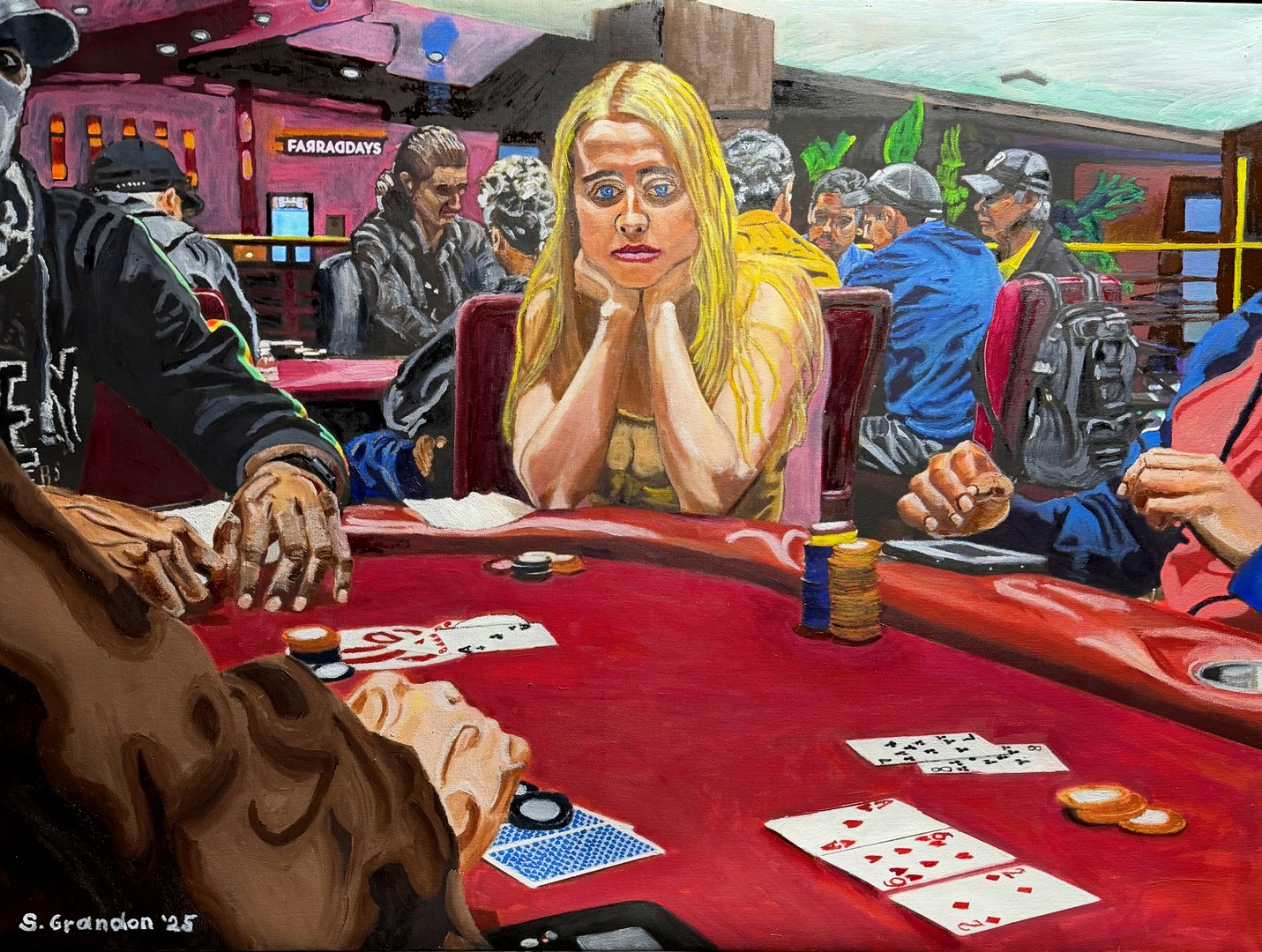 A woman sits at a poker table, surrounded by players intensely focused on the game. The bright lighting highlights the tension and excitement.